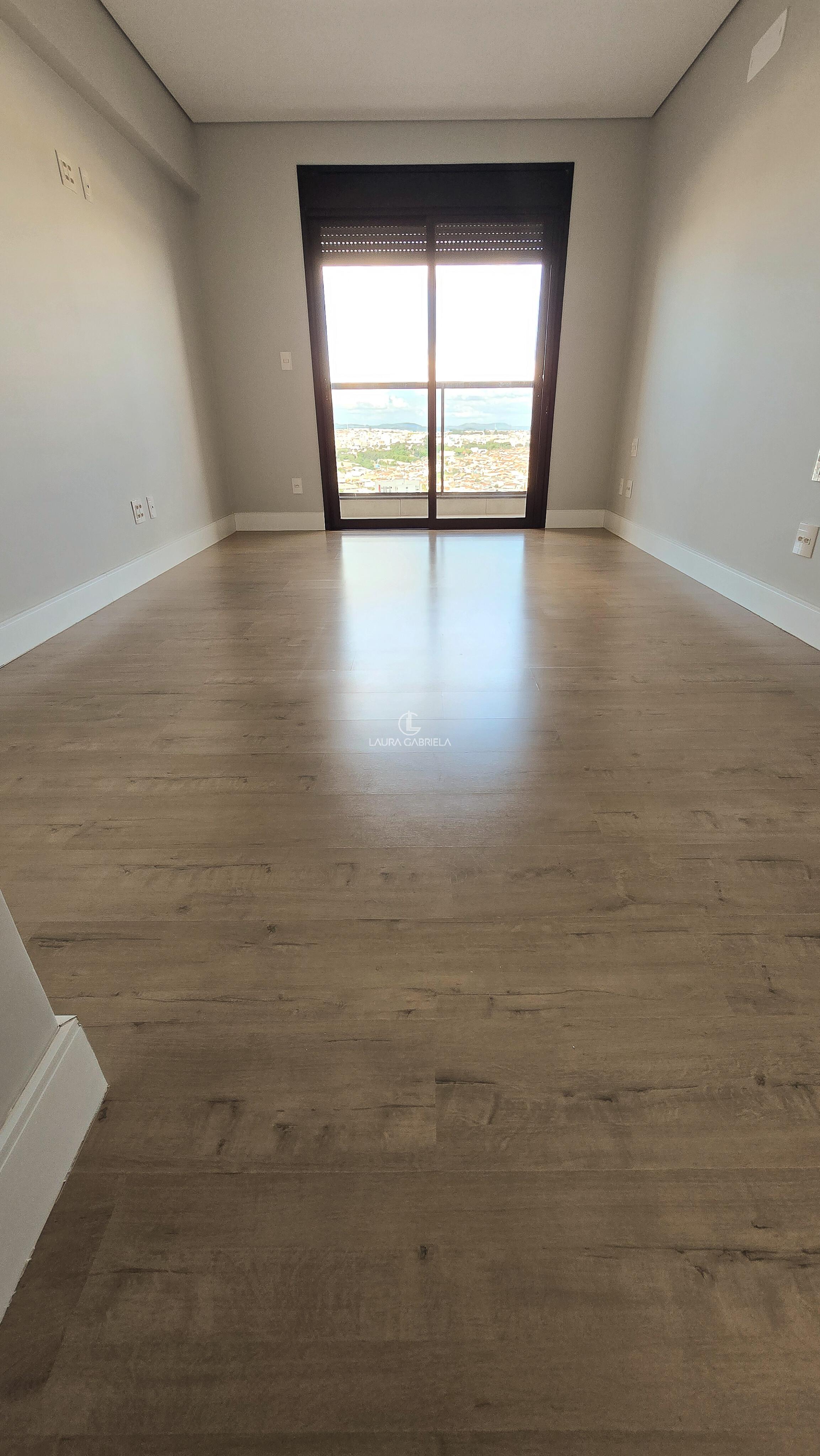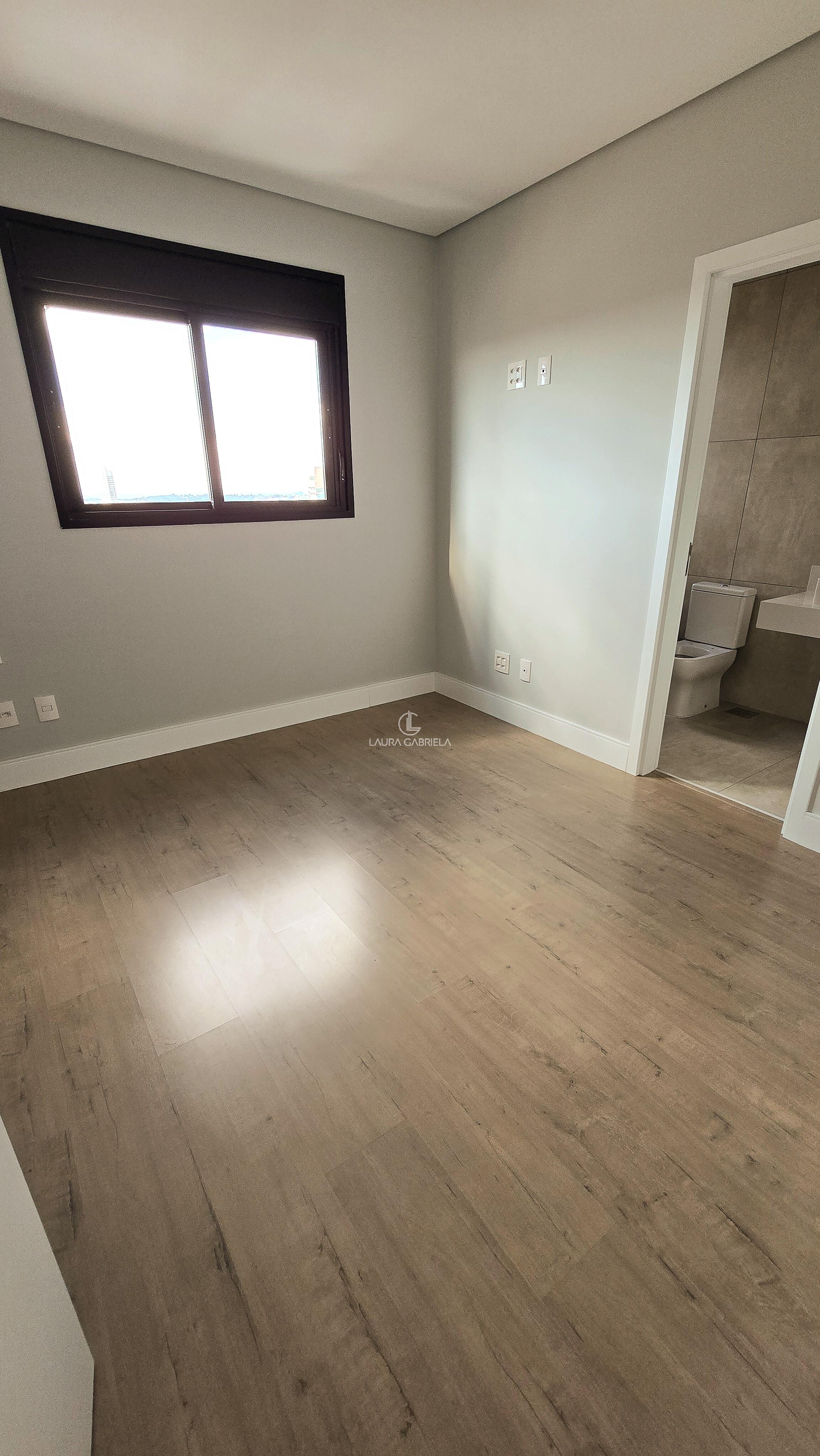 . Suítes com revestimento em laminado amadeirado e rodapé em PVC branco
